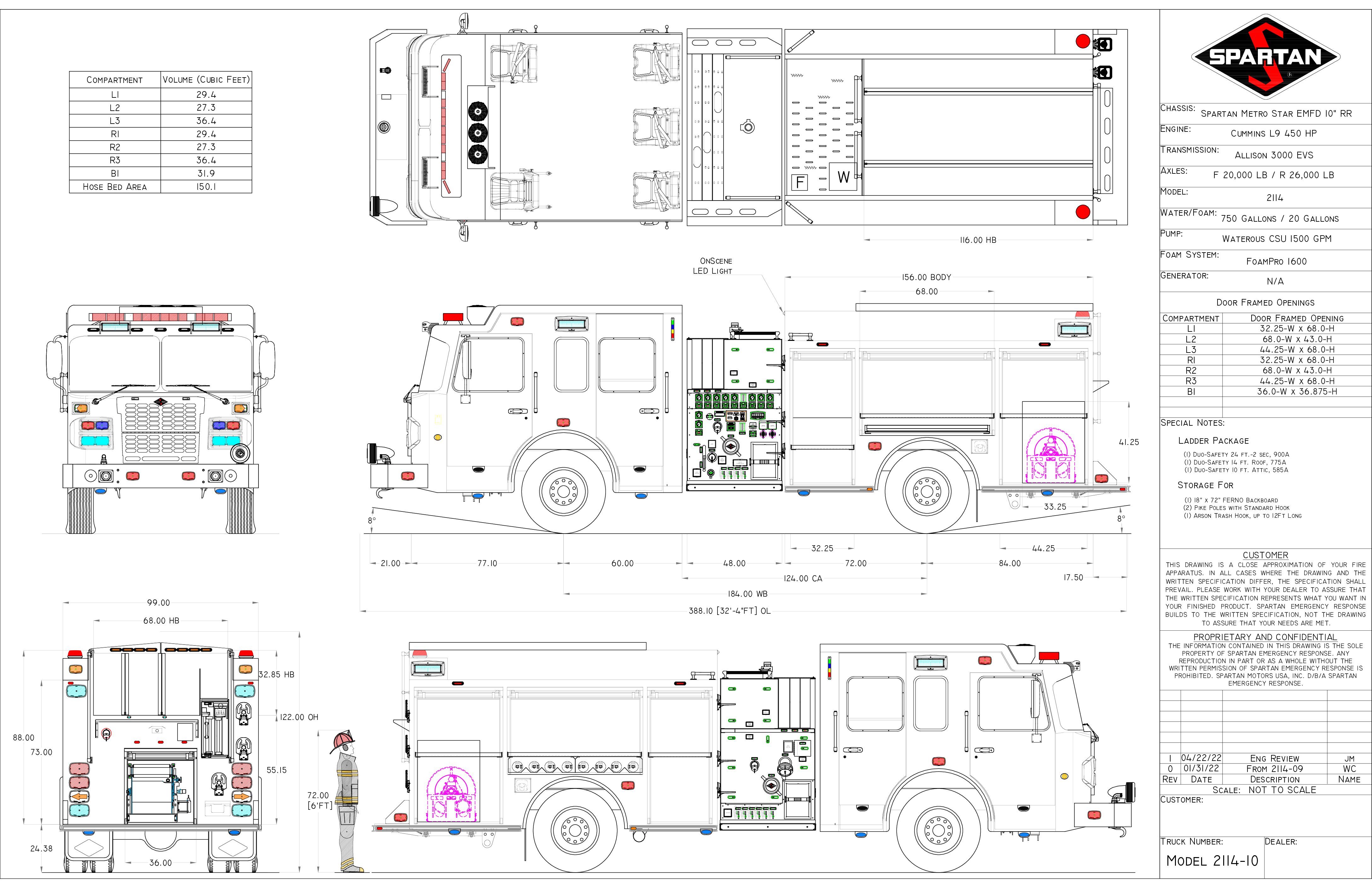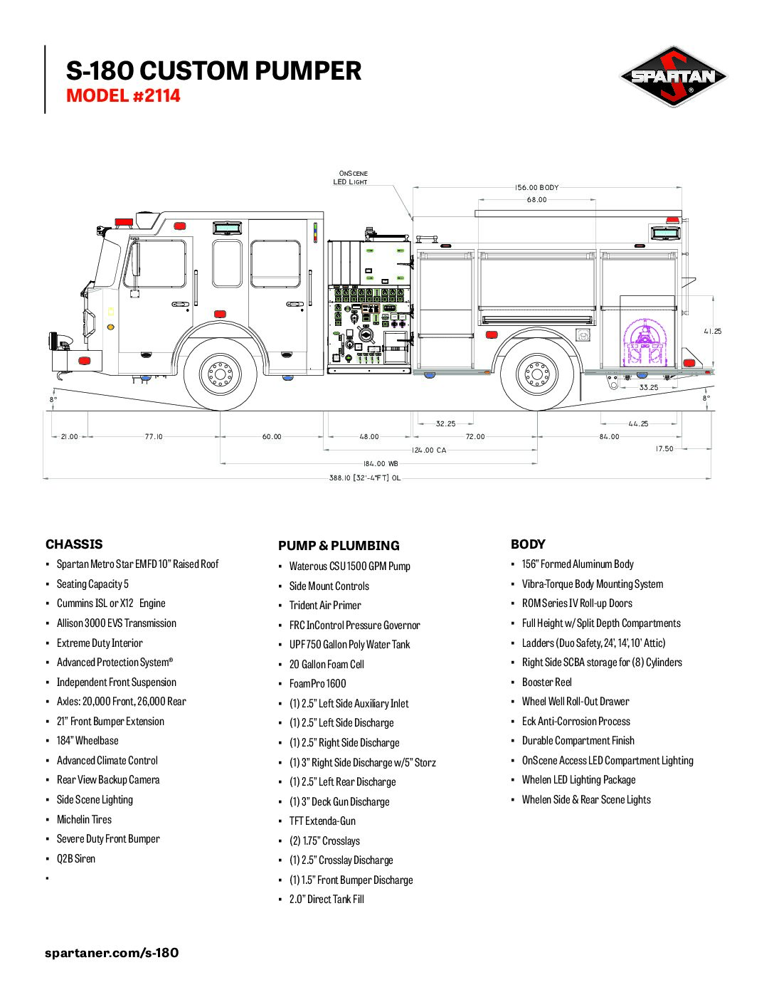 The S-180 Pumper Model 2114 is a custom side mount pumper featuring a Waterous 1500 GPM pump and 750 gallon tank. The S-180 pumper line delivers all the quality and reliability you expect from Spartan, without compromising strength, safety, storage, comfort or your schedule.